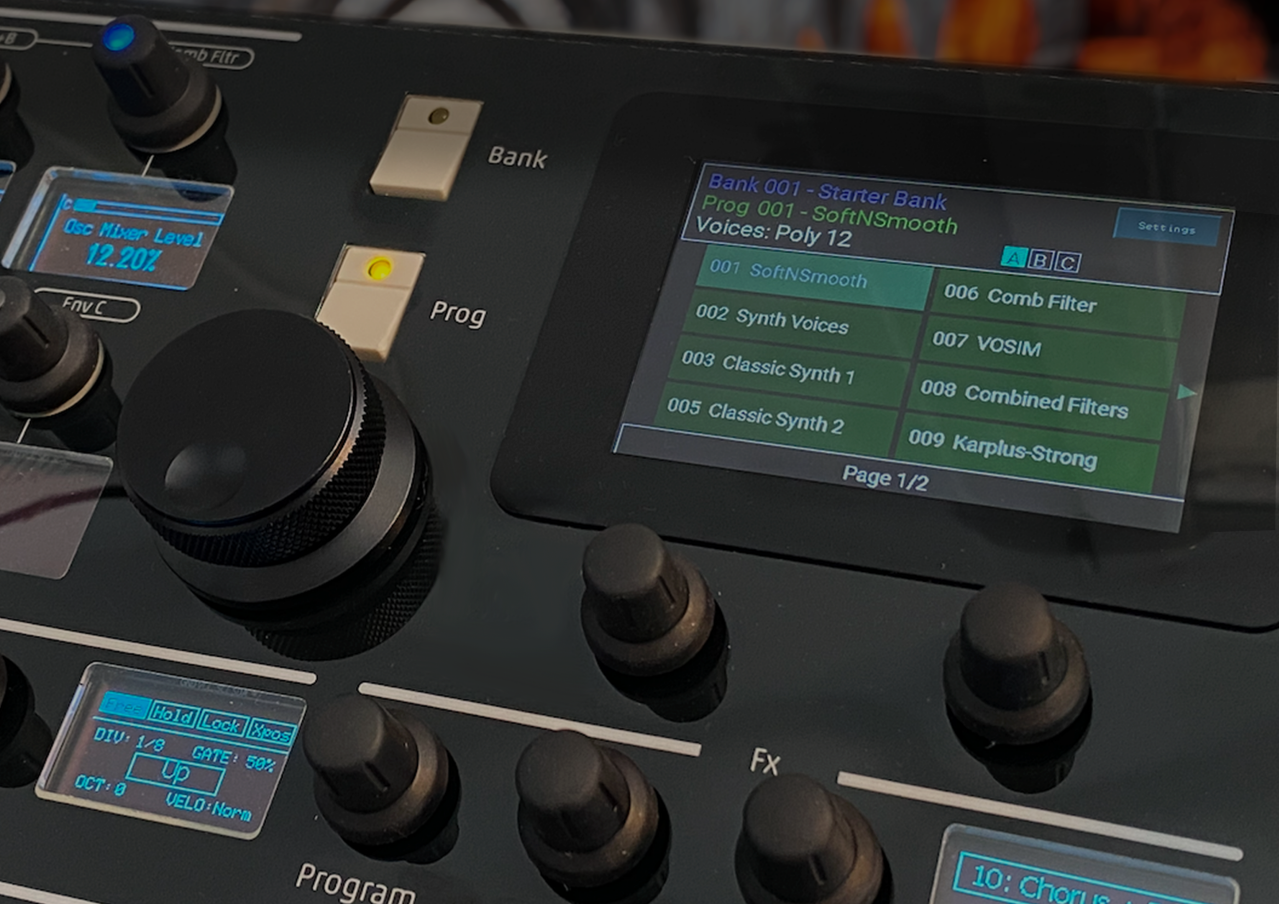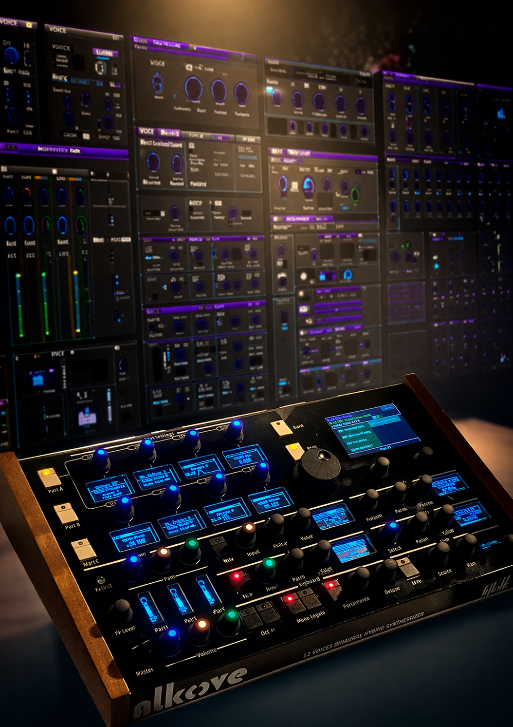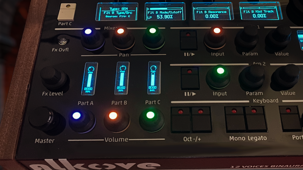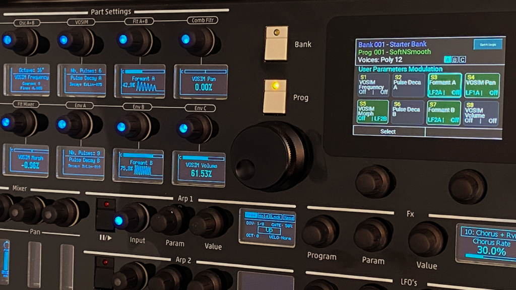 Beyond these primary controls, all parameters remain within reach through dedicated shortcuts and encoder-based navigation, allowing deeper intervention without breaking the performance flow. Global elements — LFOs, arpeggiators, effects, and performance settings — are permanently available and do not depend on the currently selected part.