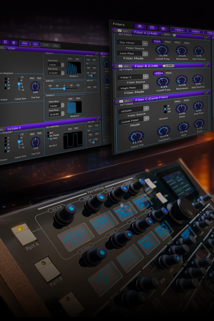 Sound sources combine traditional subtractive synthesis with classic and formant-based oscillators (VOSIM), allowing both familiar and unconventional timbres to emerge. From the earliest stages of sound creation, the instrument is built around an integral stereo architecture, where space, phase, and depth are part of the synthesis process itself.